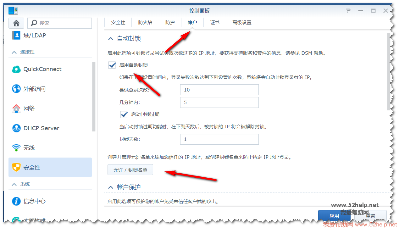4. 点击“账户”选项卡,群晖Nas默认是开启“启用自动封锁”的