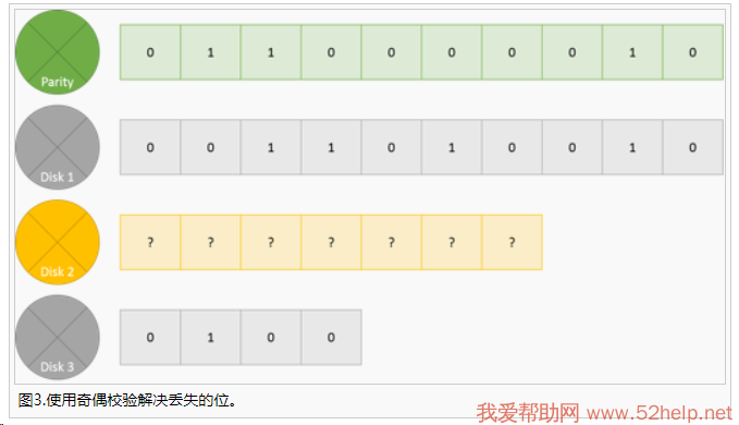 要在新更换的磁盘上重建数据,我们使用与以前相同的方法,但不是解决奇偶校验位,而是解决丢失的位。对于第1列,总和为0(偶数),因此丢失的位也必须为0。对于第6列,总和为1,是奇数,因此,丢失的位也必须为1。