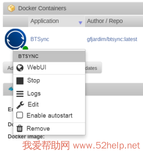 下载完成后,该应用程序将自动启动。要与您的应用程序进行交互,我们首先单击unRAID Web界面的Docker页面上可见的图标。这样做将使上下文菜单出现多个选项: