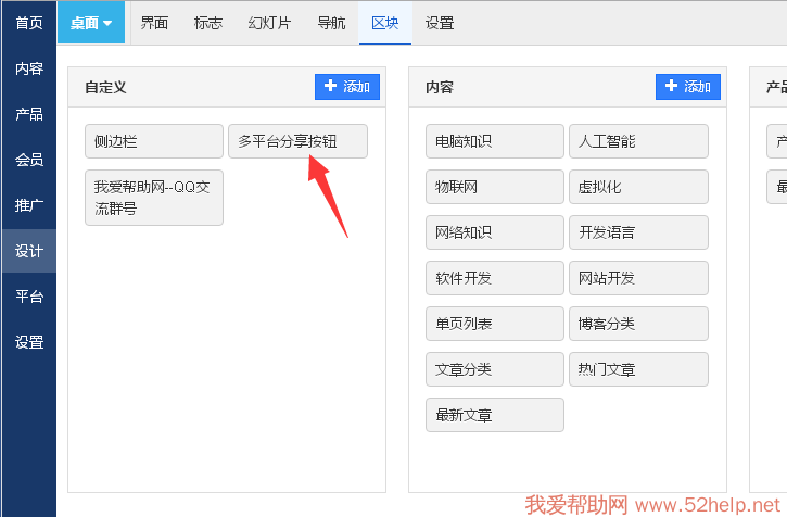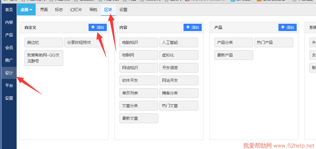 1、打开蝉知网站后台,在设计-区块下 添加一个新的功能模块