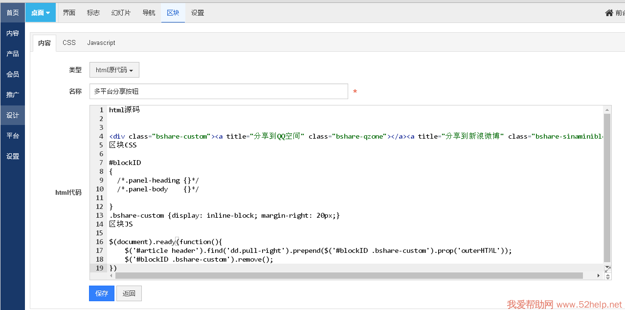 2、添加新建后,打开自定义内容编辑页面,类型我们选择html源代码,名称可以自定义。下面提供了html源代码,CSS和JavaScript的代码。直接复制粘贴进去就可以