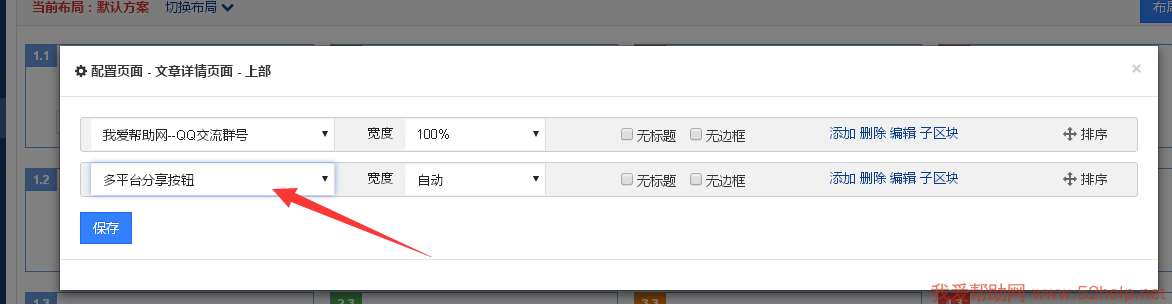 5、在配置页面-文章详情页面的 部分上添加 刚添加的功能模块。