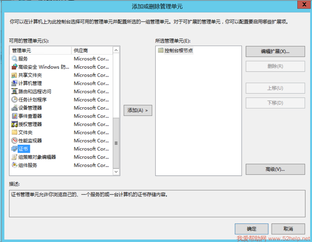 也可使用 MMC,添加或删除管理单元,选择证书 确定