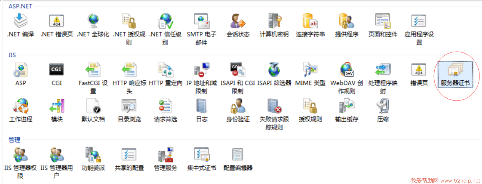 安装服务器证书,进入IIS,点击主机名,选择服务器证书