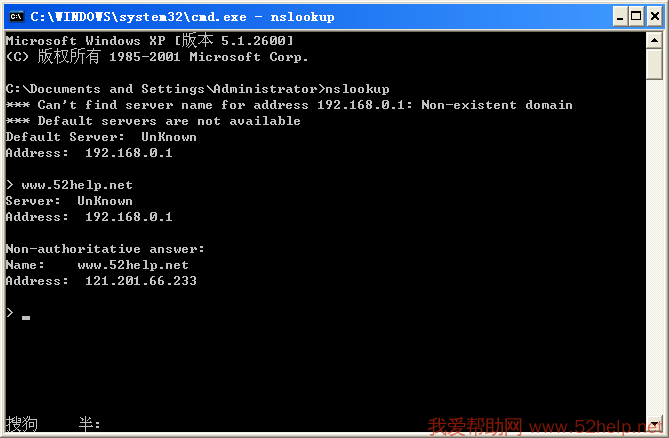 3、输入无法访问的站点域名。如这里输入www.52help.net,假如不能访问,我们会收到DNS request timed out,timeout was 2 seconds的错误提示。这说明我们的计算机确实出现了DNS解析错误。如果DNS解析正常,会反馈回正确的IP地址