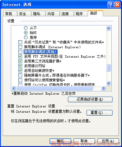 2. 打开IE浏览器工具-Internet选项-高级,将“禁用脚本调试(Internet Explorer)”和“禁用脚本调试(其他)”选项前面的对勾去掉,点击确定。