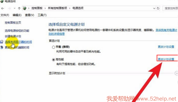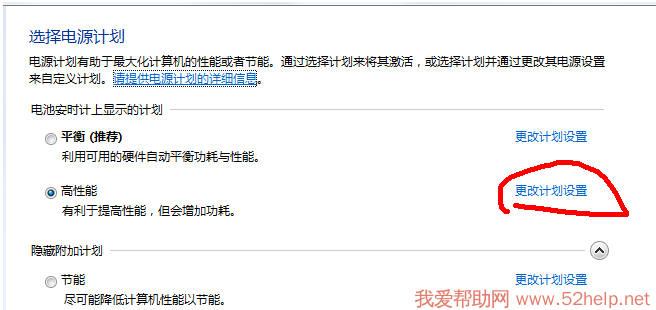 2. 在选择电源计划窗口中中,高性能后面点击 更改计划设置.