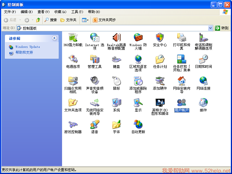 1.打开 控制面板,点击用户帐户(类似的win7 是用户帐户和家庭安全)
