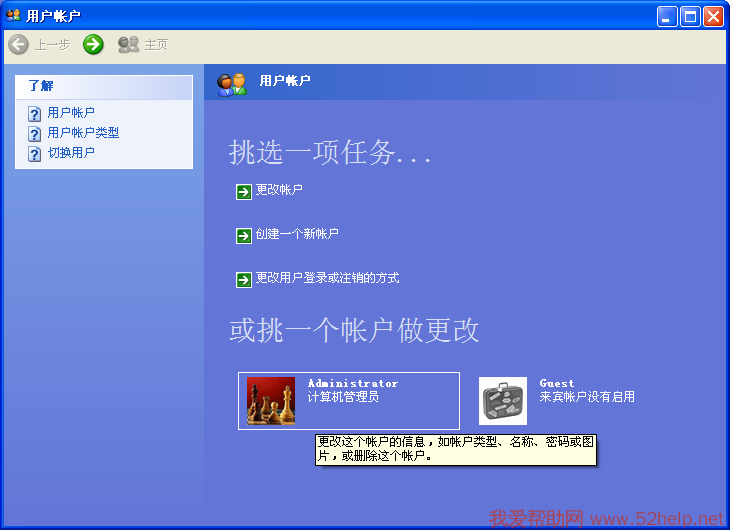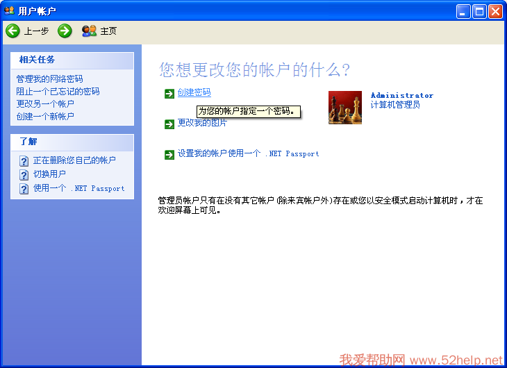 2. 选择需要添加密码的用户帐户,如果没有创建其他用户,一般情况下都只有一个Administrator超级管理员用户,为此用户添加密码即可