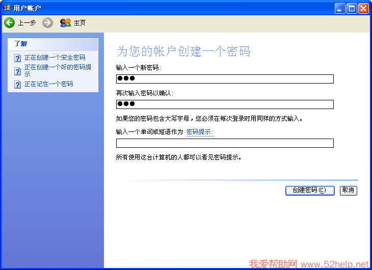 3.打开用户帐户,创建密码,添加一个锁定时打开的密码,重复录入确定后保存