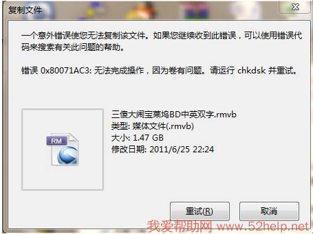 “在使用U盘复制文件的时候提示:一个意外错误使您无法移动该文件夹。如果您继续收到此错误,可以使用错误代码来搜索有关此问题的帮助。错误0x80071AC3:无法完成操作,因为卷有问题。请运行chkdsk并重试。”