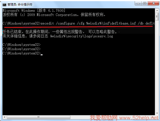 3. 还原系统默认权限设置, 快捷键win+r 打开运行,输入cmd,再输入“secedit /configure /cfg %windir%infdefltbase.inf /db defltbase.sdb /verbose”