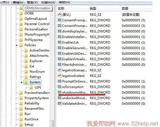 2. 快捷键Ctrl+R打开“运行”,输入“regedit”打开注册表,找到:HKEY-LOCAL- MACHINE\SOFTWARE\Microsoft\Windows\CurrentVersion\policies点击“system”文件夹, 然后双击右侧的“shutdownwithoutlogon”项,在框里面的数据数值改成“1”