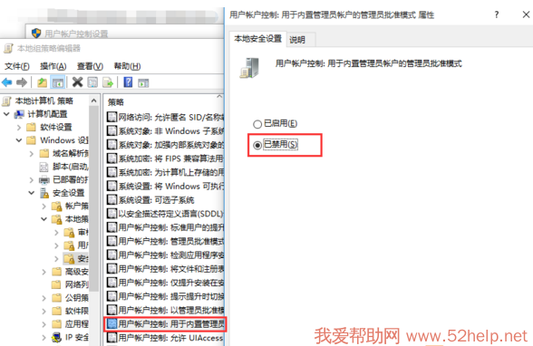 3. 在右侧下拉选择“用户账户控制:以管理员批准模式运行所有管理员”,双击它,选择“已禁用”,重启即可