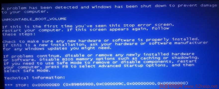 在电脑使用时,突然出现蓝屏,关机重启后,问题依旧。提示“A problem has been detected and windows has been shut down to prevent damage to your computer.UNMOUNTABLE_BOOT_VOLUME”,错误代码是0x000000ED。如下图