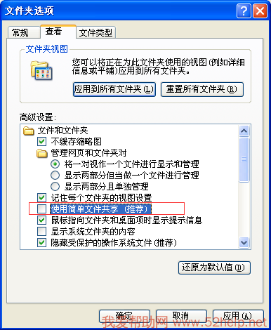 2. 切换到查询选项卡,在高级设置找到“使用简单文件夹共享(推荐)”,把它前面的√去掉。