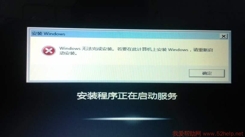 在安装win7系统时,系统还原成功,但是在安装系统的时候提示“Windows无法完成安装。若要在此计算机上安装Windows,请重新启动安装”