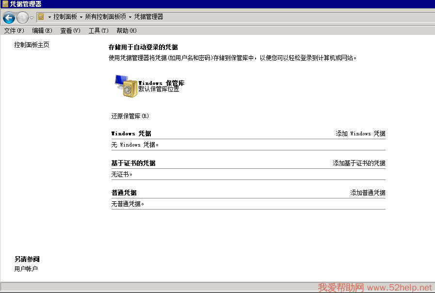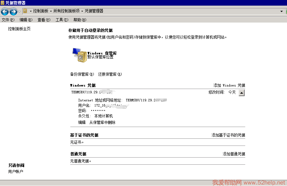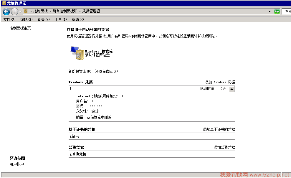 2. 在用户账户选项中,打开凭据管理器,如果之前有创建过保存凭据,我们能看到永久性类型那里不是“企业”,可以删除该保存的凭据