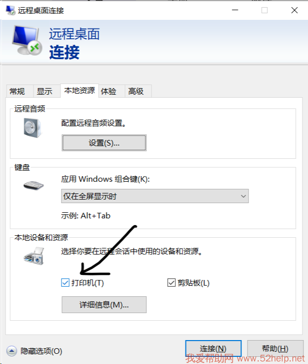七、上面方法有一个更简单的替代方法,就是mstsc 打开远程设置中 在 本地资源选卡,把本地资源设备 里的 打印机 选项 去除勾选 (我是使用这个方法解决的)