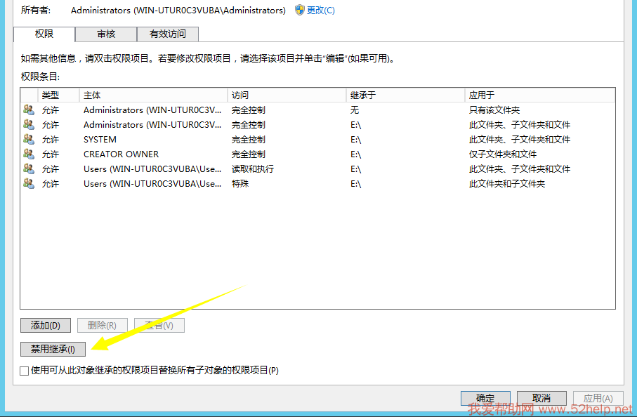 1)在安全中选择高级 选择禁用继承
