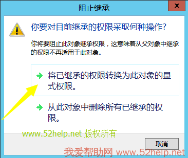 在阻止 继承中选择 第1项:将已继承的权限转为此对象的显式权限: