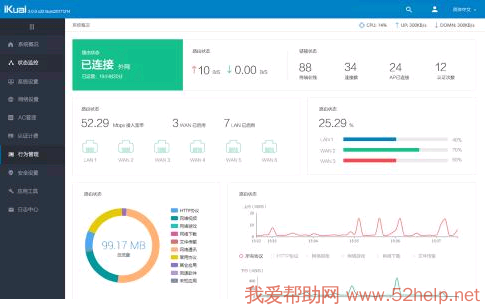 本土产品,软件全免费,靠卖硬件挣钱。基本的路由功能都有,不过上网行为管理做的比较鸡肋,软件少。爱快的系统个人认为比较偏向做局域网无线部署方案。但是好在系统是免费的,这个比较受欢迎。