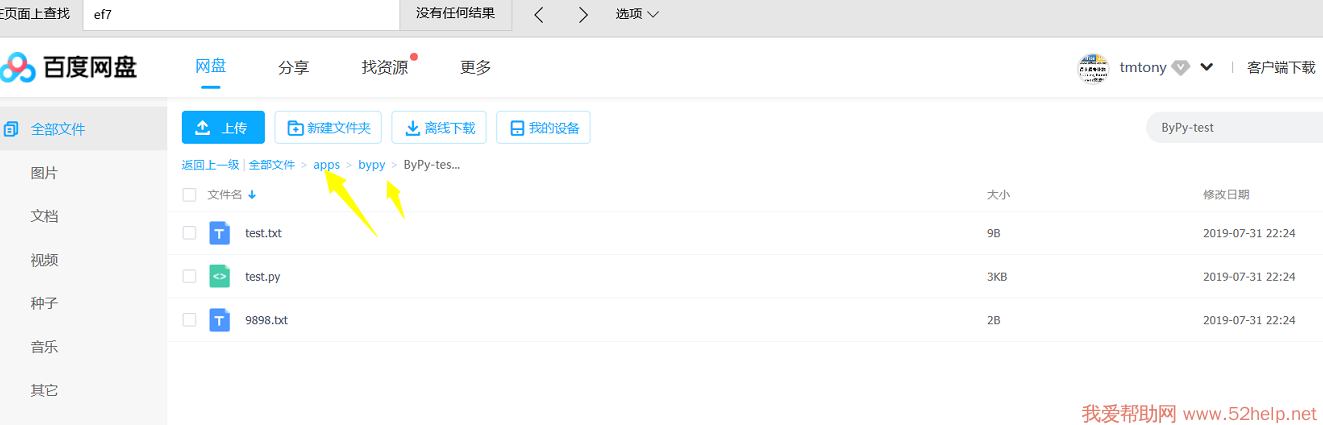 五、登录百度网盘,就可以看到出现了 我的应用数据(apps\bypy) 。由于API限制,所有文件只能存在该文件夹中。