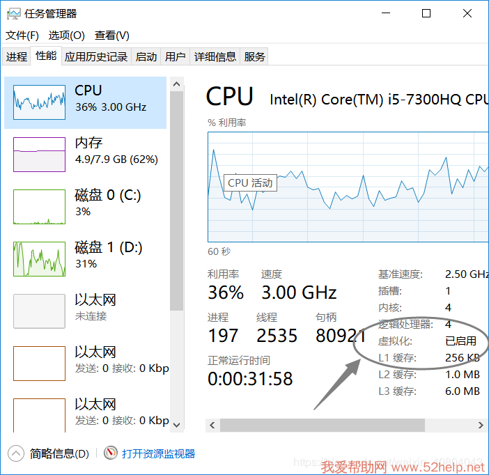 可以打开任务管理器,“性能”菜单查看“虚拟化”功能是否已开启。