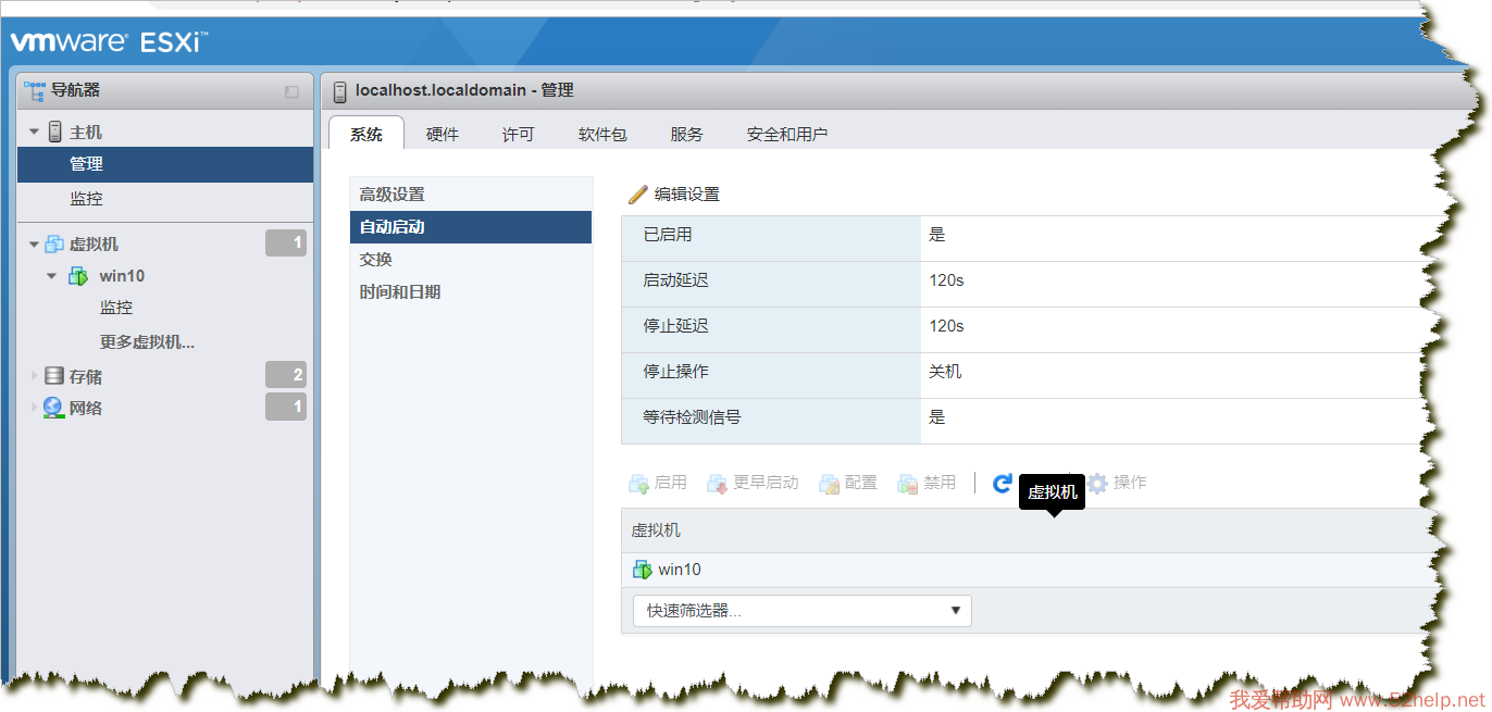 登录进入vSphere Host Client ,点击管理->系统->自动启动,进行编辑设置,已启动设置为是,启动延迟和停止延迟默认为120s ,可按自己的需求进行调整。停止操作默认为关闭电源,建议设置为关机,等待检查信号设置为是,最后点击保存。设置如下图所示。