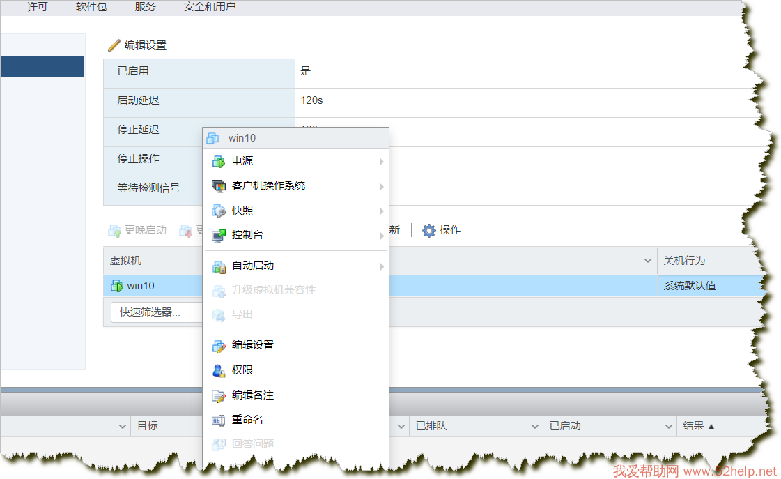 2. 右击左侧导航栏中已创建的虚拟机,选择自动启动->更晚启动 或更早启动,如图2虚拟机自动启动设置所示