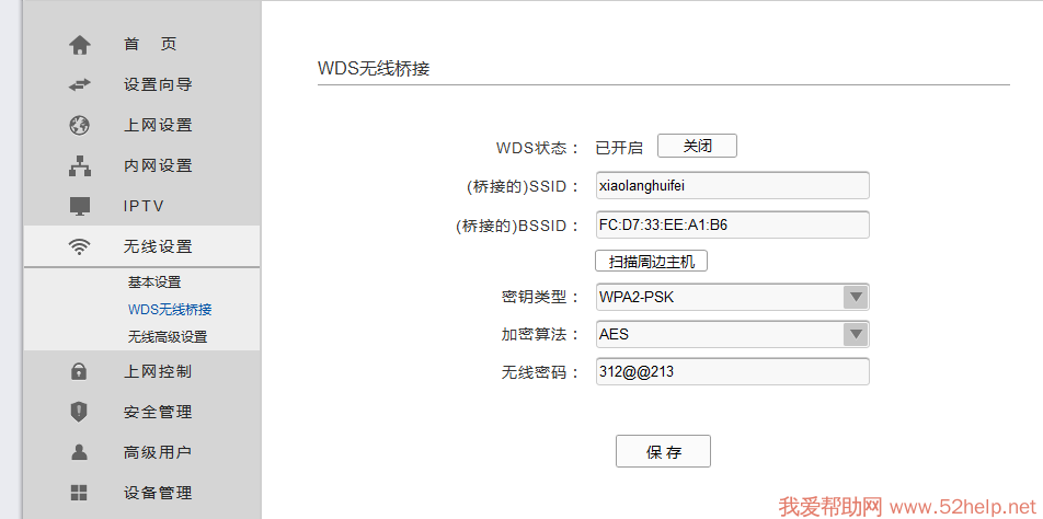 WDS设置是重点,此从路由器必须打开,而主路由器不能打开。桥接的SSID指的是主路由器发出的无线信号,桥接的BSSID指的是指的是主路由器的LAN口MAC地址,这两项可以通过点击“扫描周边主机”来找到对应的信号。这里的密钥类型,加密算法必须和主路由器的一样,这里的无线密码是连接主路由器无线信号的密码。