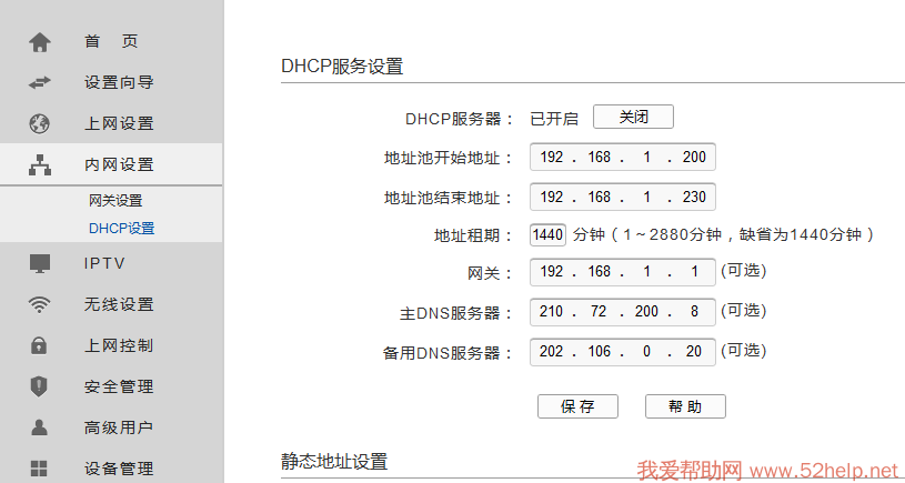 设置从路由器的DHCP,该从路由器的DHCP地址池不能与主路由器有交集,比如此例中我设置为192.168.1.200 ~ 192.168.1.230,DHCP的网关必须设置为主路由器的LAN口IP地址,切记不能设置为从路由器的网关地址。还有DNS服务器地址最好要和主路由器一样。