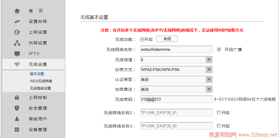 下面的无线网络名称是从路由器发出来的,可以随便设置,无线密码也可以随意,这里切记的一个是无线信道必须和主路由器一致,否则无法桥接成功。加密方式、认证方式和加密算法也需要和主路由器一样。
