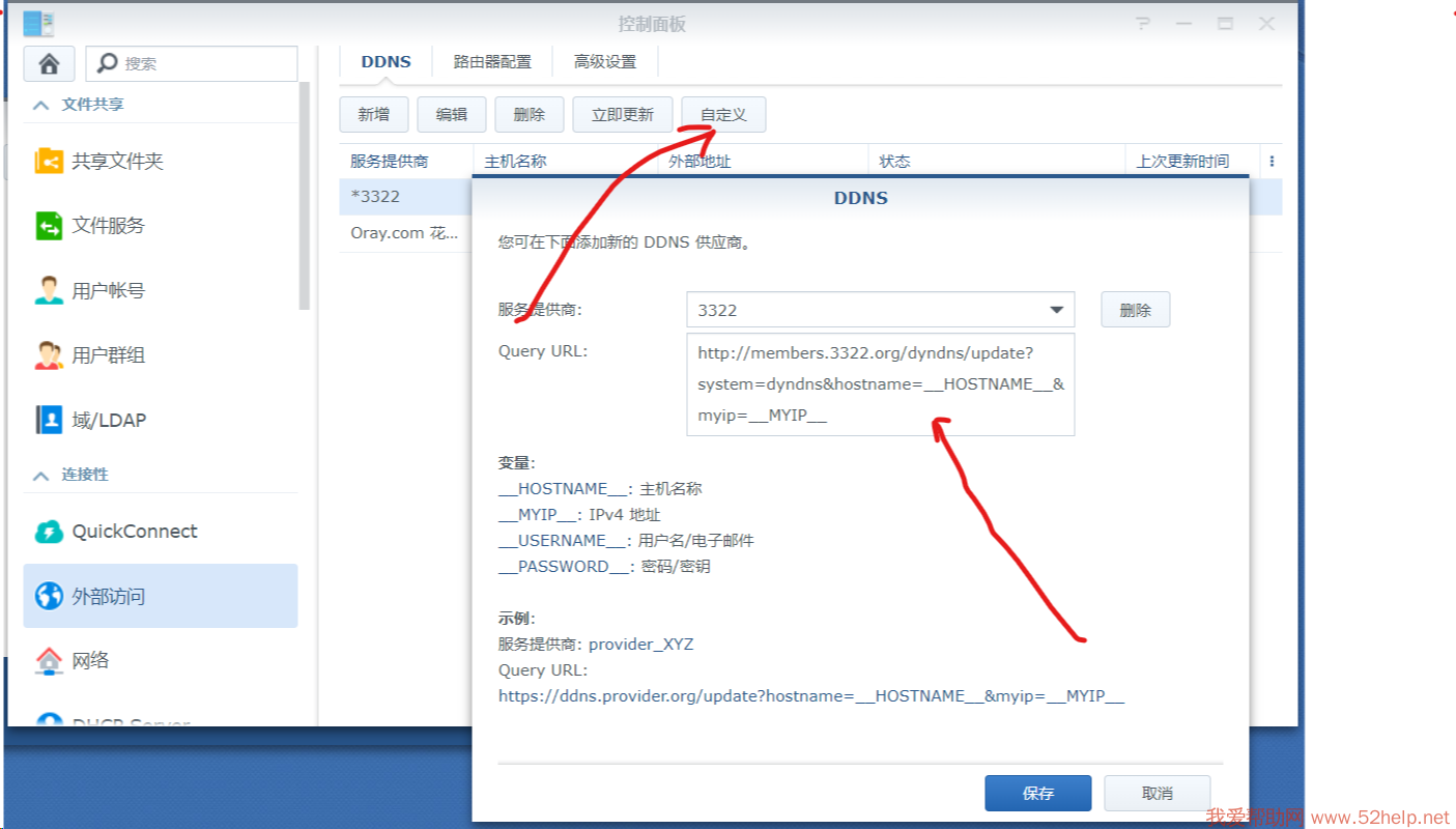 三、群晖默认是没有3322动态域名提供商可选择,需要自定义,按下面步骤