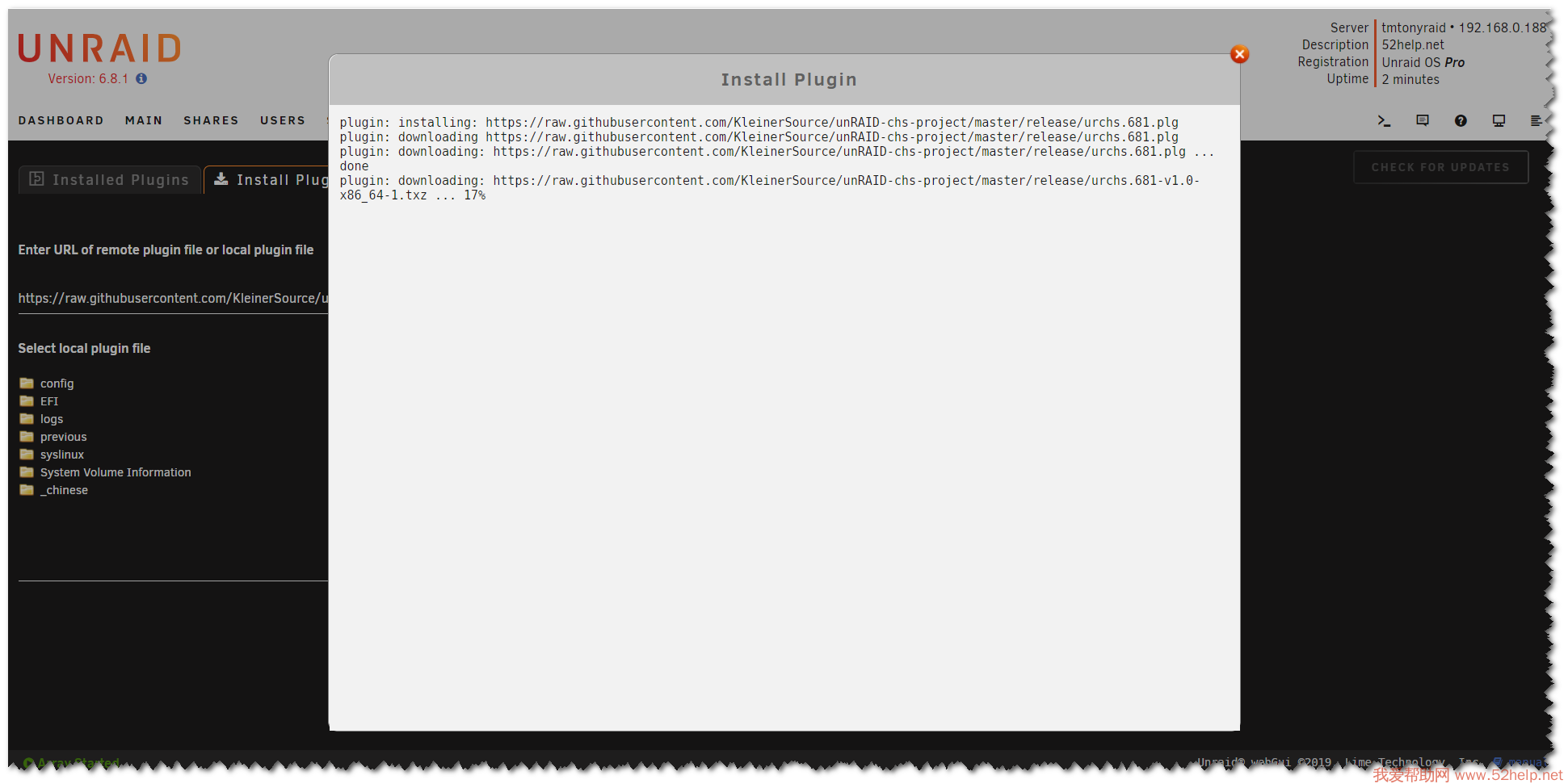 plugin: downloading: https://raw.githubusercontent.com/KleinerSource/unRAID-chs-project/master/release/urchs.681.plg ... done