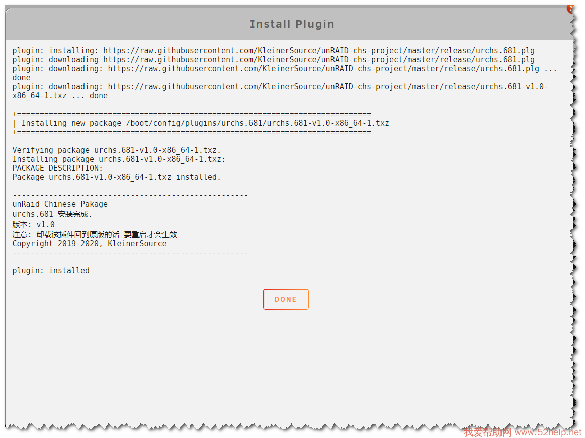 4.单击Done, 查看unraid 6.8.1 汉化插件已经安装好了