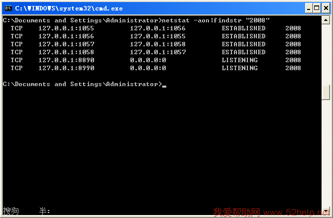 2. 输入 netstat -aon|findstr "2008" 查看指定端口的占用情况
