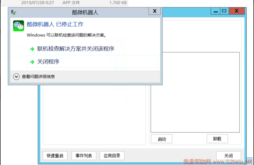 酷微新版开发环境启动时出现酷微微信机器人已停止工作,如下图所示
