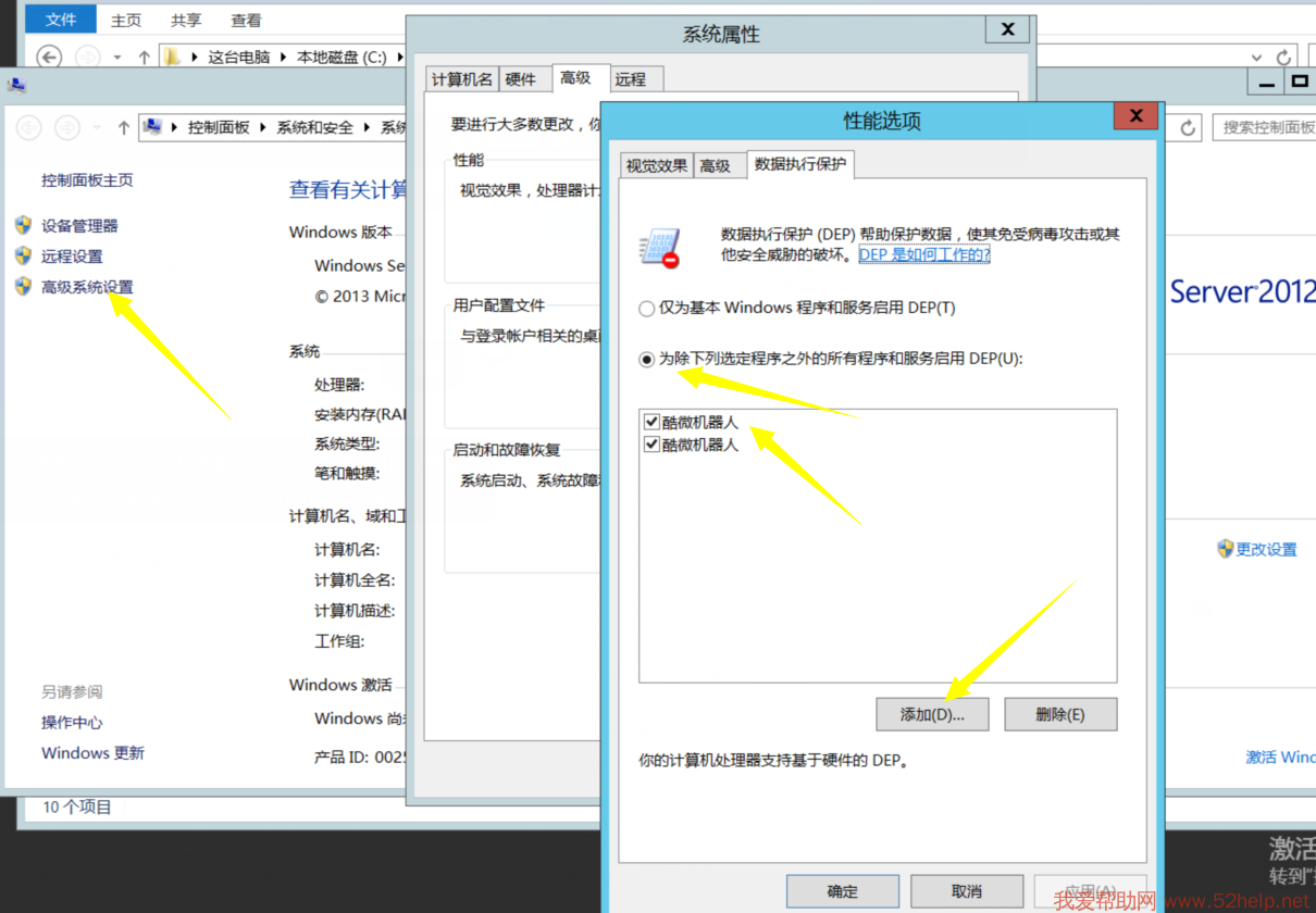 在我的电脑 右键 属性中设置 高级 性能选项 数据执行保护 为除下列选定程序之外的所有程序和服务启用DEP(U) ,使用添加地,将你的主程序 添加在这里